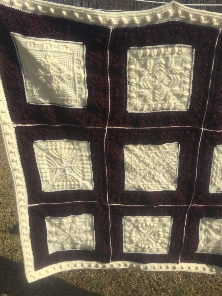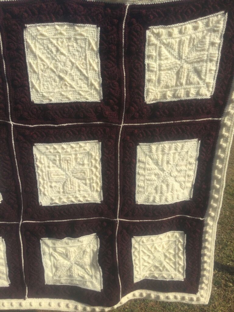 - Modular Construction: The blanket is composed of individual, expertly crocheted squares, framed and joined to create a grand, quilt-like appearance (often called a “Clanghan” or modular afghan).